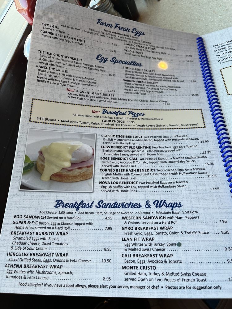 Blend of home fries with fresh gyro meat, spinach, tomato, and feta cheese, topped with 2 eggs any style, served with grilled pita bread.